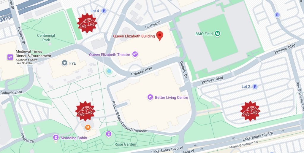 From the West End: Enter Exhibition Place via British Columbia Road or Dufferin Street.